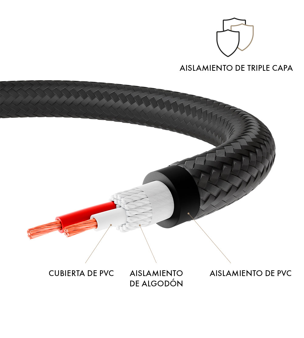 - Una cubierta exterior de tejido trenzado y PVC, flexible y resistente, que protege el cable de interferencias.